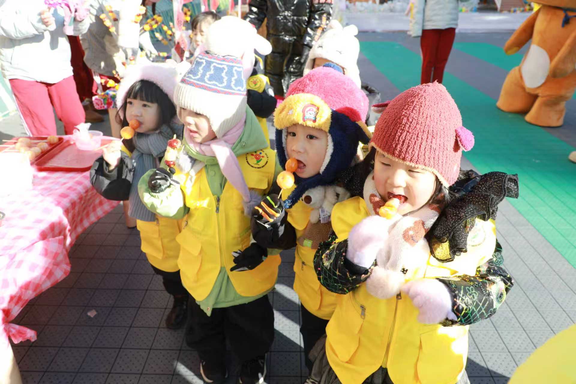 游戏间隙,幼儿捧着温水解冻的冻梨、冻柿子,小心吸吮着天然的甜蜜;冰糖葫芦的糖壳在阳光下晶莹剔透,咬下去是酸甜交织的清脆声响。这些传统冬日美食,同样在孩子们的味蕾上留下了独特的冰雪记忆。