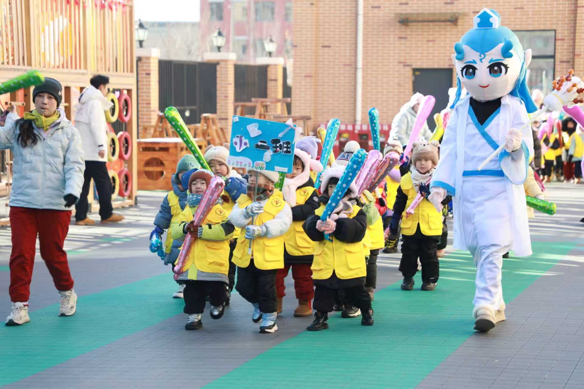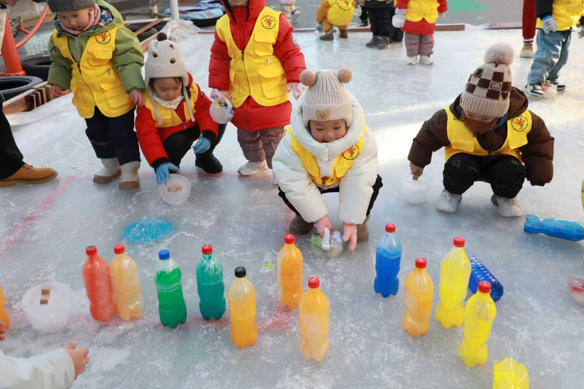 活动现场,全体师幼共同点燃“冰雪火炬”,同跳“冰雪欢乐操”,哪吒、敖丙等幼儿最喜爱的萌趣玩偶惊喜现身,与幼儿热情互动,嘉年华正式拉开帷幕。冰上保龄球游戏中,幼儿瞄准前方排列整齐的“保龄球”奋力投掷,随着“哗啦”一声响,欢呼声此起彼伏;冰上陀螺游戏中,只要轻轻一抽,陀螺便飞速旋转起来,孩子们追随陀螺的轨迹奔跑,脸上写满兴奋与专注;冰壶挑战赛中,幼儿合力推动冰壶,在冰面上展开趣味比拼,不仅锻炼了手部力量,更培养了团队协作意识;冰上爬犁游戏中,幼儿在老师的协助下滑动爬犁,清脆的笑声传遍整个园区;冰上曲棍球游戏中,幼儿手持简易球杆,追逐着冰面上的小球,尽显童真与活力;敲冰块盲盒区充满了未知与惊喜,幼儿手持小锤,小心翼翼地敲击冰块,当发现藏在其中的小礼物时,激动地跳起来与同伴分享喜悦;勇闯雪迷宫区域,幼儿在洁白的雪地间穿梭、探索,时而驻足观察,时而快速奔跑,在寻找出口的过程中体验着挑战与成功的快乐。