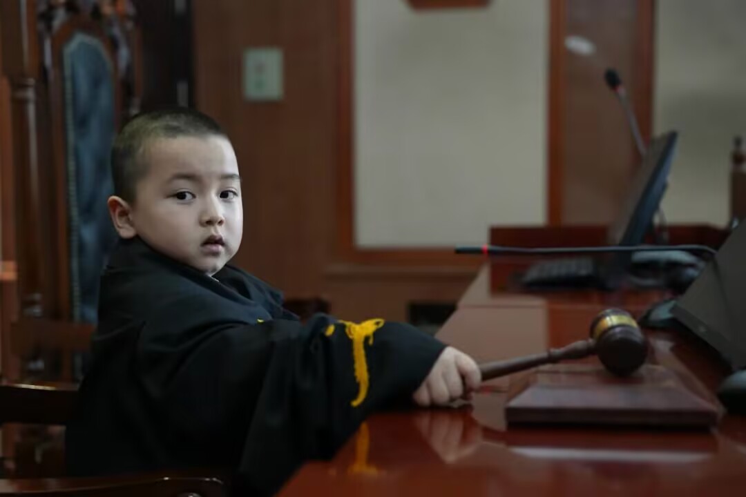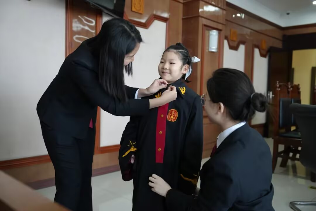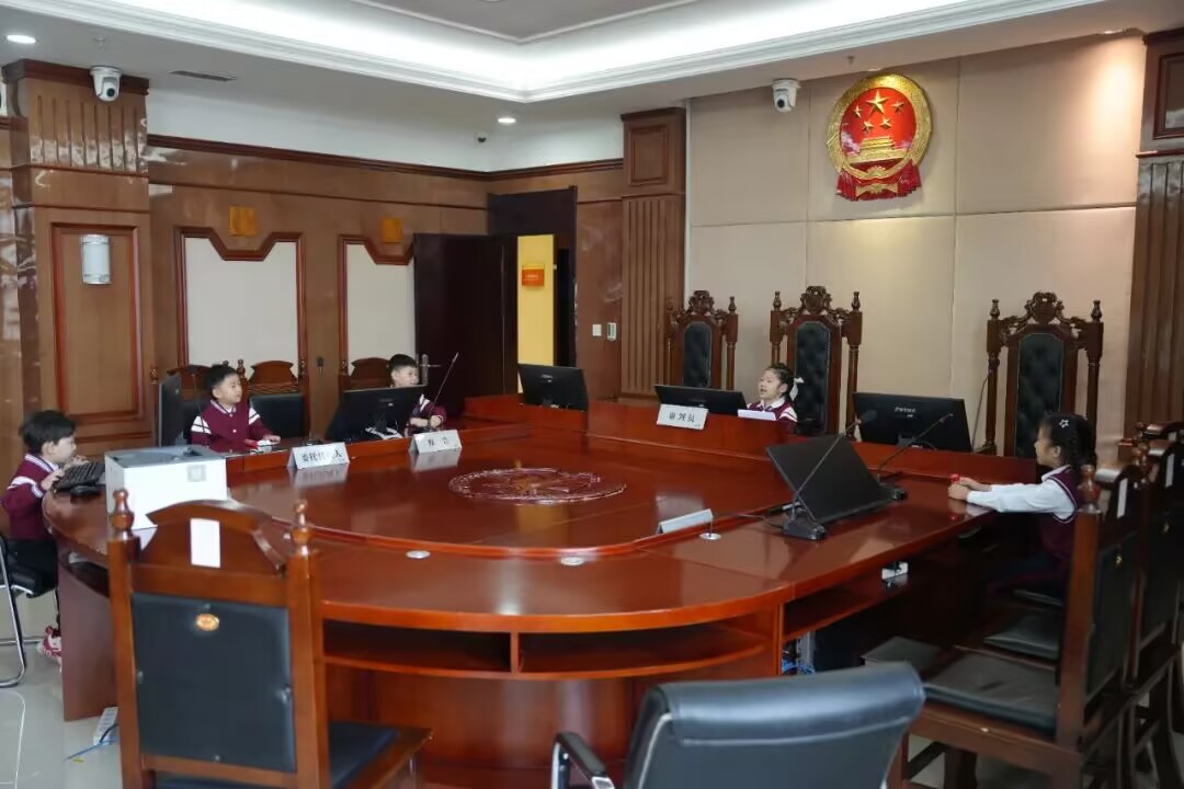 紧接着,孩子们走进了专门为保护未成年人权益设置的数字化圆桌法庭。在法官的带领下,小朋友们化身“法官”“书记员”“原告”“被告”“证人”,围绕一个“小熊购买到假冒伪劣糖果”的虚拟案件展开了一场沉浸式模拟“庭审”。